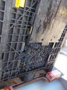 While we didn’t have to help pick any grapes, we did head over to the destemmer to work the sorting line. First, the whole bunches are picked and put into bins which are stacked on the sorting machine line.