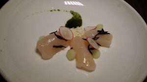 The raw fish dishes lived up to Chef Schlow’s intent. All delicate and delicious, each bite was filled with a myriad of flavors, from the Kusshi oyster (Fennel puree, caviar) and Albacore Poke (dragon fruit, tobiko, coconut soy) to the Hamachi (piquillo puree, serrano chili relish, avocado mousse, masago, purple plum radish) and Scallop Crudo (nori oil, pickled apples, sesame powder, hijiki, radish).