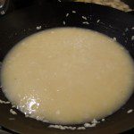 Back to the second pan, when the onions start to brown, add the rice and stir.Then add approximately 1/2 glass of white wine and mix. Let it sit a few minutes to pick up the flavor.