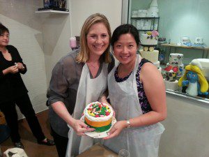 We were then invited to sit down with a partner and were told to decorate a cake in the theme of “classic California cuisine.” What is classic California cuisine? So many things came to mind……sushi, tacos, hot dogs (Pinks / Dodger Dogs), burgers (In-N-Out)…..but while these are all classic “LA” items, we decided that true California cuisine is salads. So, we got to work.