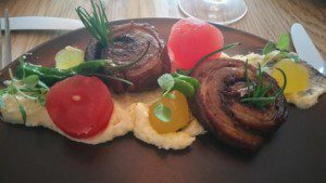 Pork Belly and Sword Squid with apple, broccolini and shilling bean