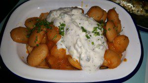 Gigantes – The large beans are cooked in a light tomato sauce and topped with the tzatziki, strained yogurt mixed with cucumbers, garlic, salt, olive oil, red wine vinegar. The tzatziki is not runny and watery like you may find other places and you may also want to order a side dish of it.