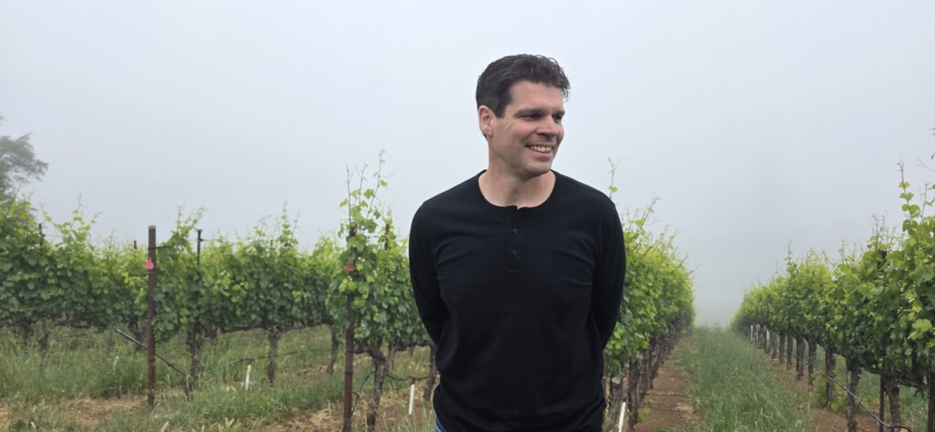 Winemaker Jeff Pisoni met us outside. As we stood in the wet, cold fog, we could barely see the vines in front of us. The vineyards stand on steep, decomposed sandstone slopes where thick fog lingers low before lifting to reveal warm afternoon sun. Wet winters, dry summers, and nutrient-poor soils make farming challenging, but the Schwartz family, who planted vines here in the 1980s, embraced sustainability from the start, favoring organic herbicides over synthetics.