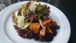 Roasted Beet Salad with lolla rosa lettuce, raw goat cheese and sherry vinaigrette