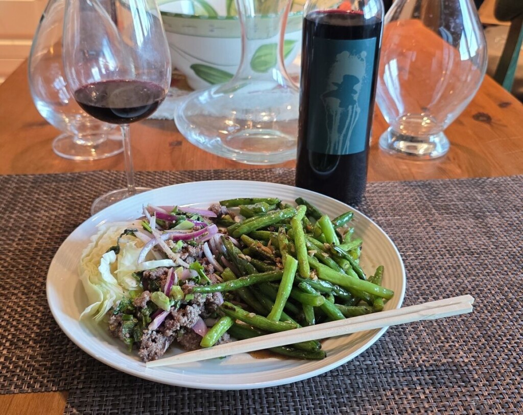 Dom makes wines that are food friendly and this wine is a perfect example. It can be paired with grilled rack of lamb or a spicy mushroom dish. Regional Sales Manager Eric Phanngavong suggested beef larb so that is what I tried. And it was a great pairing. The wine was a nice compliment to the ground beef with fresh mint, lime, and onion. The wine did not overpower the dish nor get overpowered by the food. Instead, it was a harmonious pairing that I enjoyed very much.