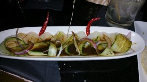 I started with a Bebibas Ancestrales and ordered the Aguacatero (Mezcal, avocado, green chartreuse and lime). The drink comes with a worm salt rim that was spicy and a cricket garnish. Yes, crickets…..after all, they say that insects are the new protein. I went outside my comfort zone and tried them and despite the visual image, they were slightly salty and crispy and don’t really taste like anything. I survived!