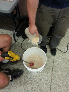 After the mash cooks and cools, a small amount of the mash is taken out of the tank and the yeast is mixed into it.