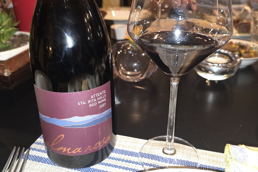 On a visit to Alma Rosa Winery in the Santa Ynez Valley, I was looking at a rack of wine bottles, recognizing the dark blue...